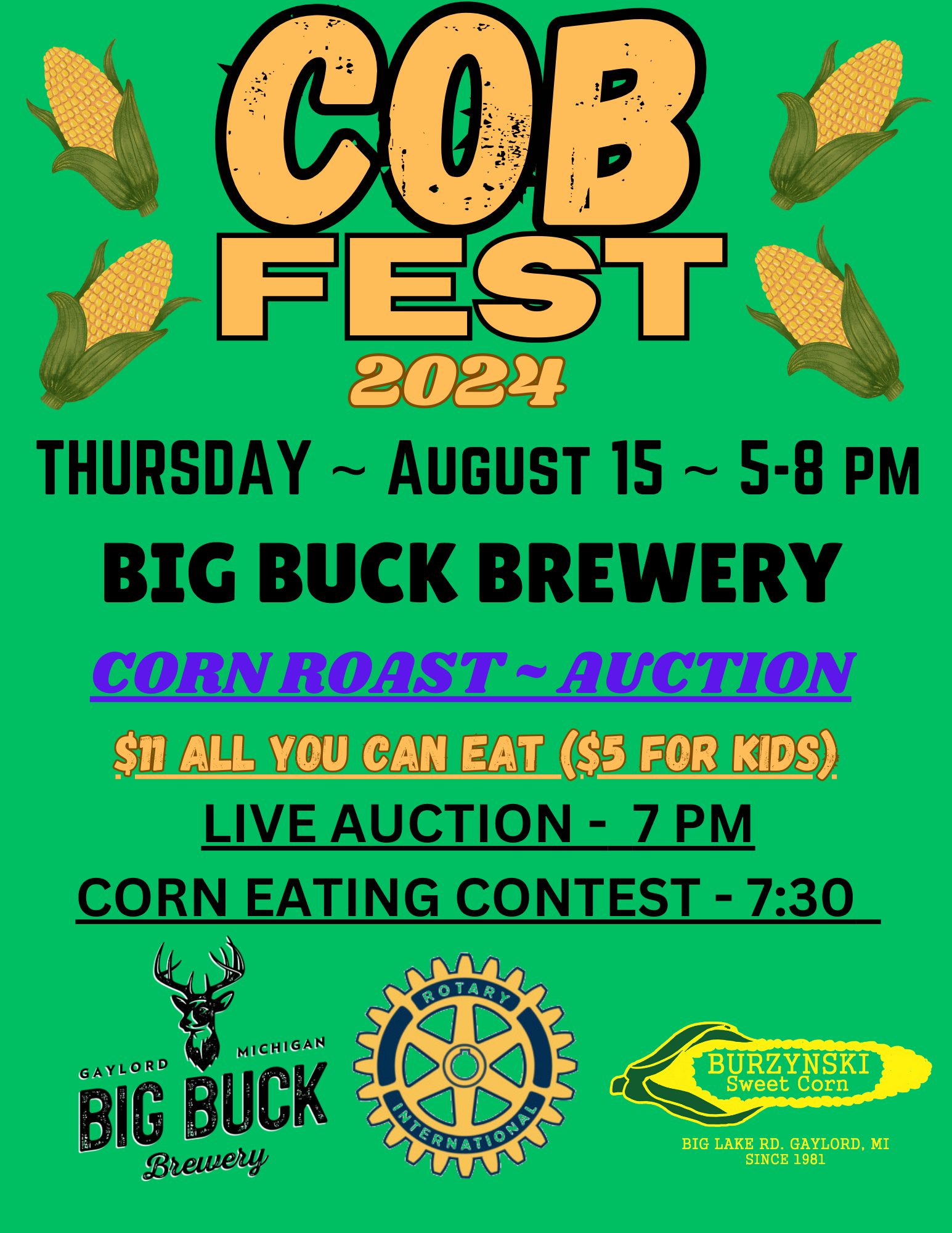Come feast at the Rotary Club of Gaylord's 2nd annual corn roast and auction.Roasted cobs are $3 with unlimited toppings or all-you-can-eat for $11. We will have the incredible parm-garlic-butter dunk(YUM)We're raising money for our local Rotary club, which helps with all kinds of projects around the community.There will be a running silent auction and live auction at 7pm7:30 pm are the corn-sprints. Who can finish 3 cobs the quickest.?Please join us this Thursday evening, at Big Buck Brewery in Gaylord, for a memorable auction and corn roast! Our chairperson has a marvelous spread of corn toppings to enjoy. Auction items are still coming in and some are quite exciting, including a unique opportunity to tour the Mackinaw Bridge tower! Only 25 passes for this experience are made available each year. Come see what's in store!